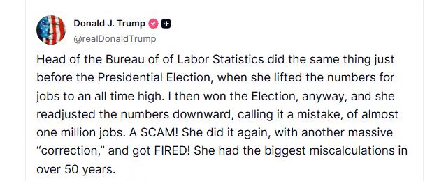 特朗普称,这是一场“骗局”,麦肯塔弗近期再次对就业数据进行“重大修正”,因此被解雇。